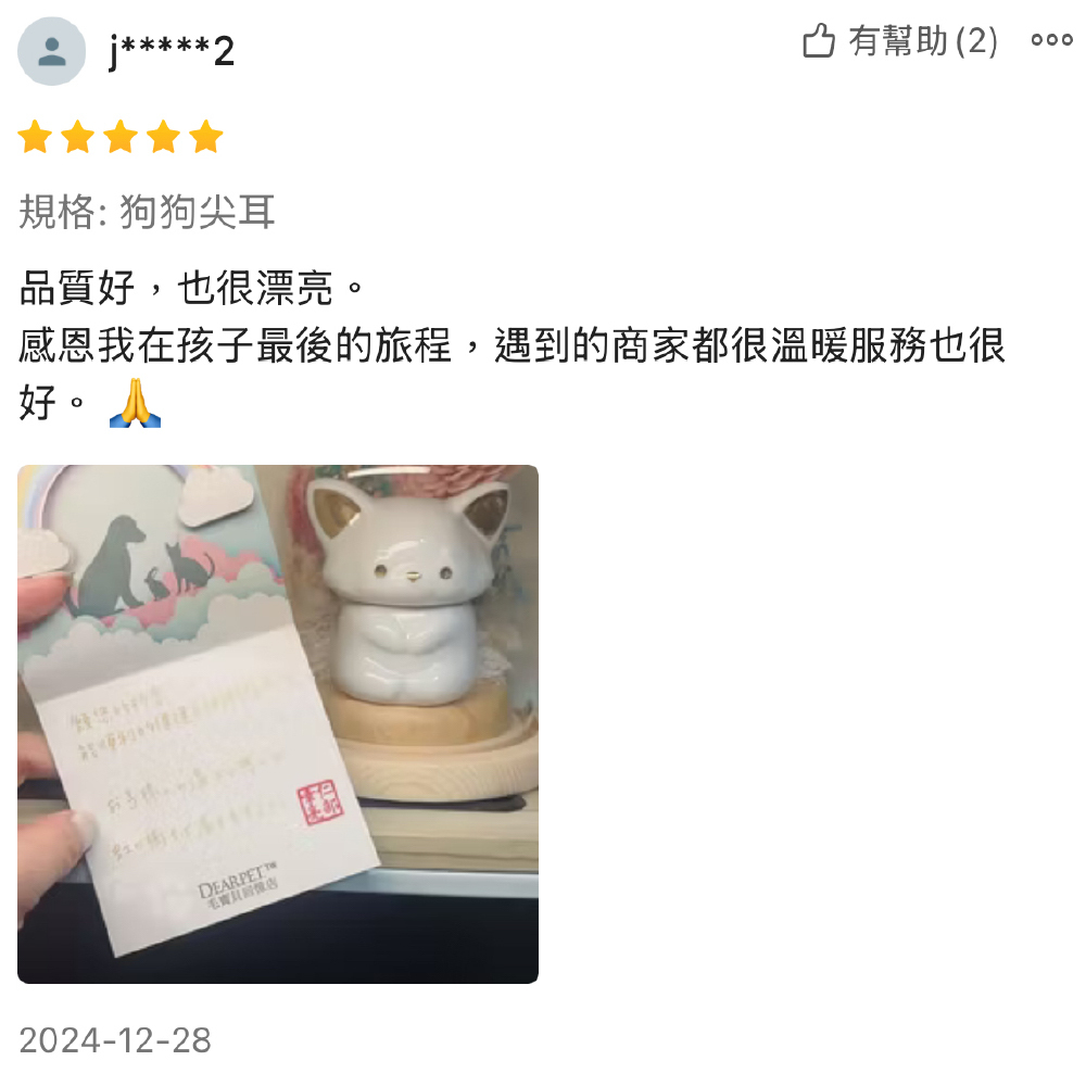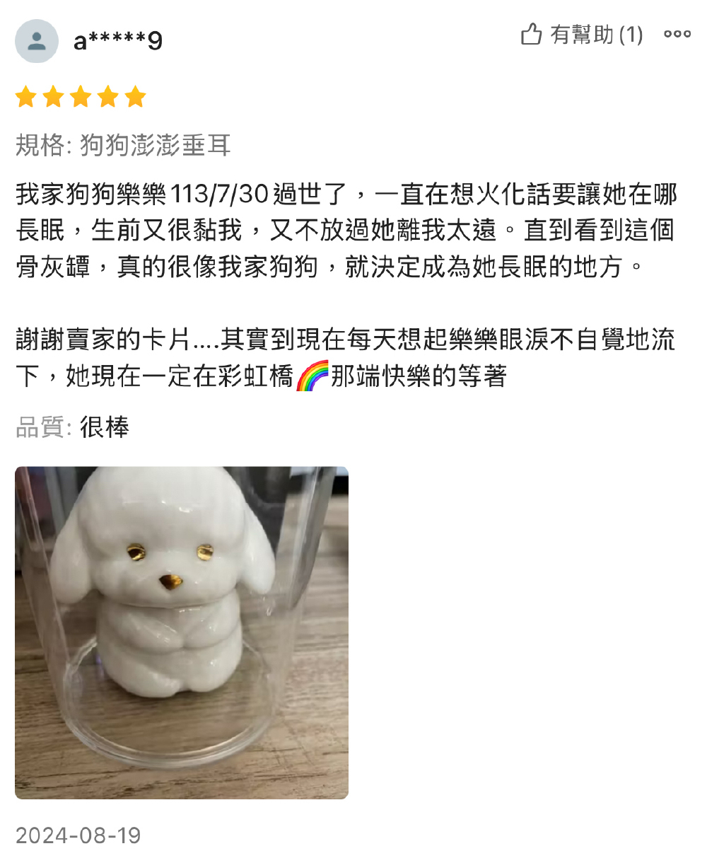A. 目前毛孩的寵物骨灰罈通常比較可愛的款式都做的比較小,所以如果真的有看到喜歡的款式但是又無法放入全部的毛孩骨灰時,可以考慮是否學日本一樣用分骨的方式喔~有些毛爸媽會擔心分骨會不會不好,但這就看各位毛爸媽的心情了,以宗教層面來說分骨是不會對毛孩造成任何問題的,反而能夠以各種方式去保管毛孩的骨灰,讓毛孩能盡可能陪在我們身邊喔~