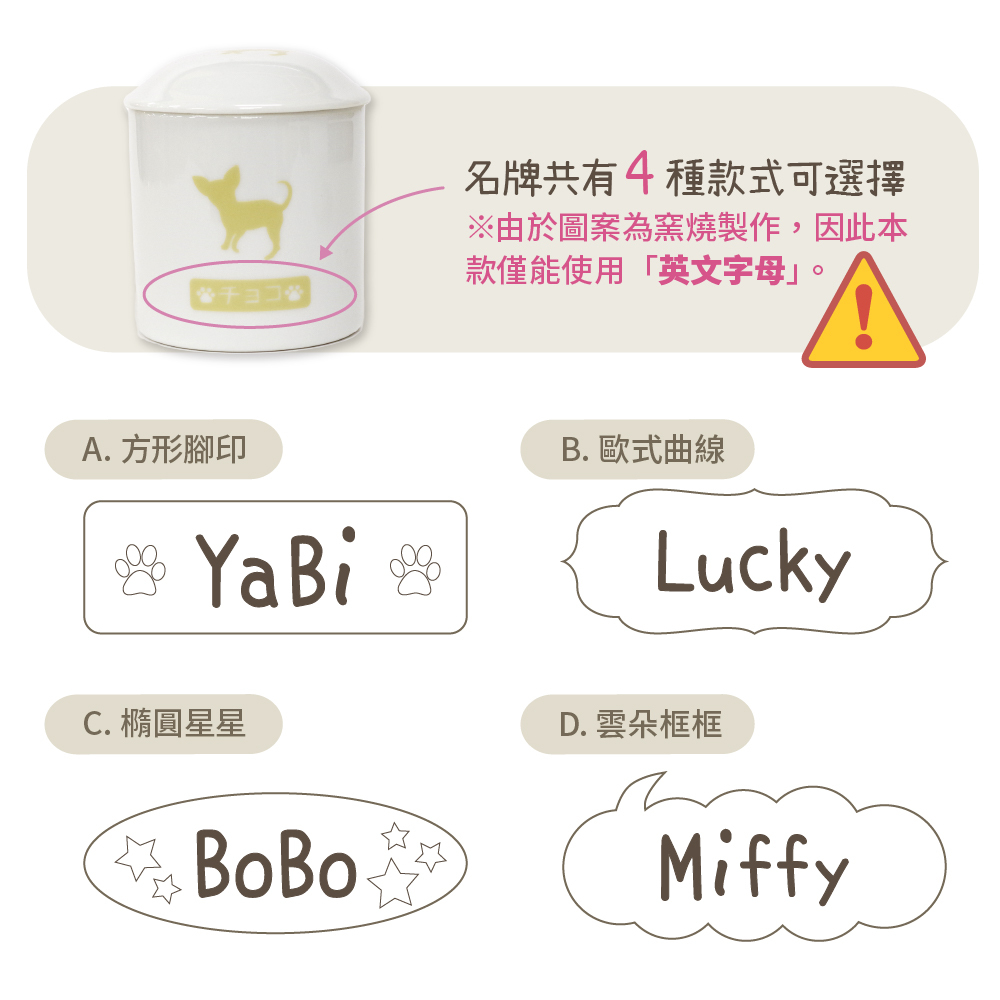 ※因名字是直接燒在骨灰罐上,只能接受英文名字